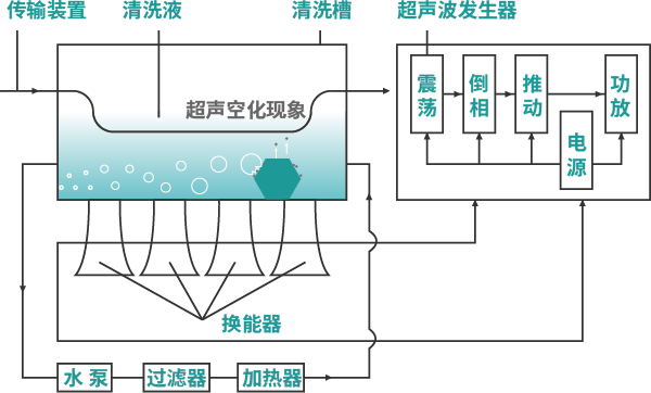 通過換能器,將功率超聲頻源的聲能轉(zhuǎn)換成機械振動,通過清洗槽壁將超聲波輻射到槽子中的清洗液。由于受到超聲波的輻射,槽內(nèi)液體中的微氣泡能夠在聲波的作用下快速變大破裂,破裂時產(chǎn)生的高強度剪切力作用于各類樣品上,從而達到清洗、提取、乳化、加速溶解、粉碎、分散等作用。