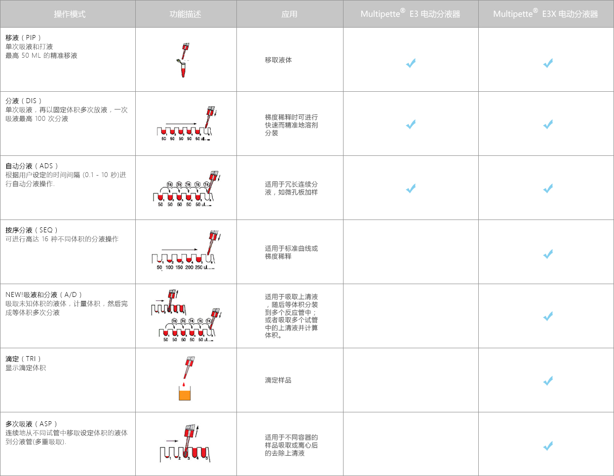 Multipette® E3/E3x 電動分液器結(jié)合 9 種不同規(guī)格 Combitips advanced® 分液管,提供從 1 μL——50 mL 的分液范圍,超過 5000 種分液體積,一次吸液可完成最高 100 次分液