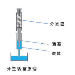 分液器結(jié)合分液管,采用外置活塞原理。分液管內(nèi)自帶有活塞,通過活塞的連接運(yùn)動移取和打出液體(類似注射器)。