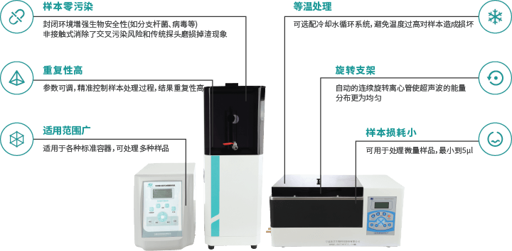 • 旋轉(zhuǎn)支架 自動(dòng)的連續(xù)旋轉(zhuǎn)離心管使超聲波的能量分布更為均勻