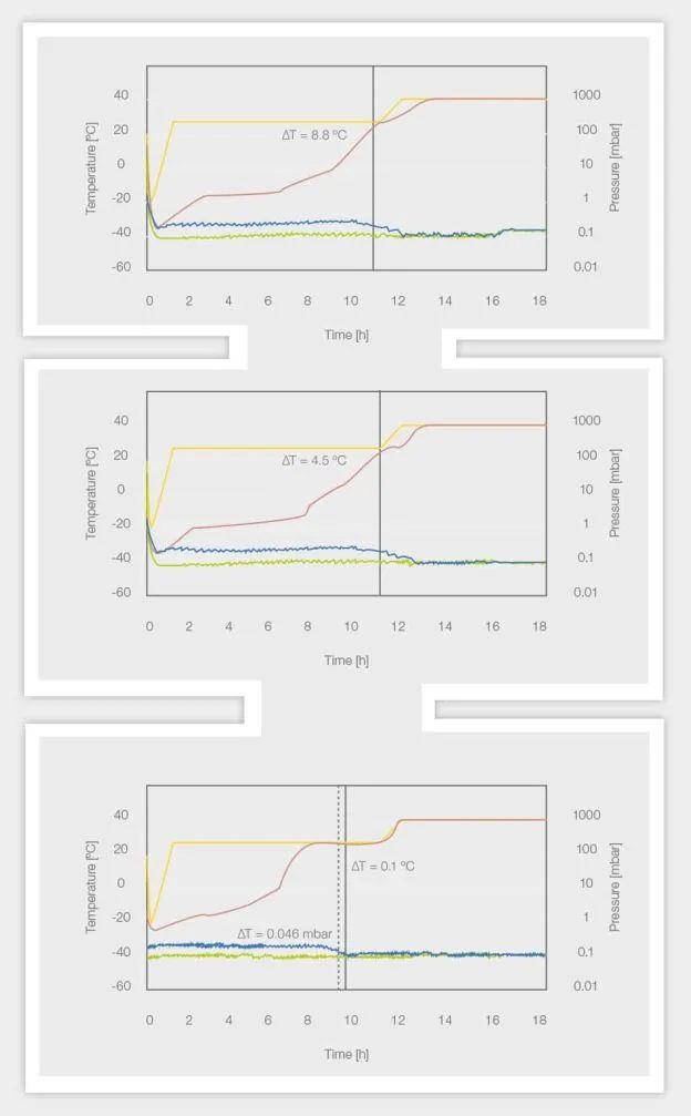 上圖所示為壓差為 0.05 mbar 的結(jié)果,中間圖為 0.03 mbar,底圖為 0.025 mbar 作為終點(diǎn)標(biāo)準(zhǔn)。在達(dá)到終點(diǎn)標(biāo)準(zhǔn)之前,壓差至少保持 60 分鐘。隔板溫度用黃線表示,樣品溫度用紅線表示,干燥箱壓力用綠線表示,皮拉尼壓力計(jì)在初級干燥(白色陰影)和二級干燥(灰色陰影)上用藍(lán)線表示。同時顯示達(dá)到壓力(黑線)和溫度終點(diǎn)標(biāo)準(zhǔn)(黑色虛線)的時間,以及該點(diǎn)相應(yīng)的溫度和壓力差。
