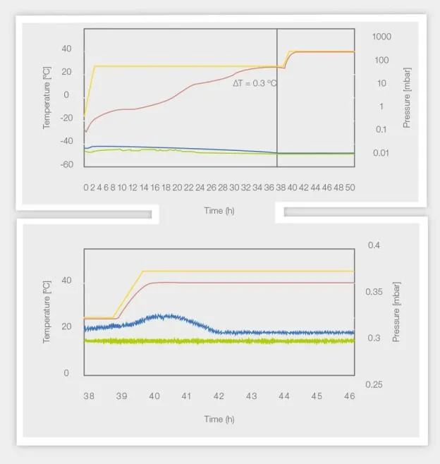 另,下圖中的頂部線顯示 37 小時后到達(dá)終點(diǎn)。此時,溫度曲線和壓力曲線在循環(huán)轉(zhuǎn)換為二級干燥之前同時合并。