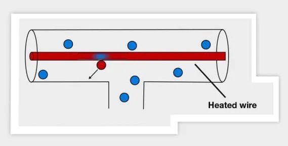 該技術(shù)使用兩種不同的壓力計(jì),一個皮拉尼傳感器和一個電容壓力計(jì)。皮拉尼傳感器的工作原理是氣體的熱導(dǎo)率隨壓力變化。壓力計(jì)用一根細(xì)導(dǎo)線懸掛在氣體中,用電流加熱來測量壓力。在高壓下,由于周圍氣體分子與金屬絲的高碰撞率,金屬絲將熱能損失給氣體。這一原理如下圖所示。