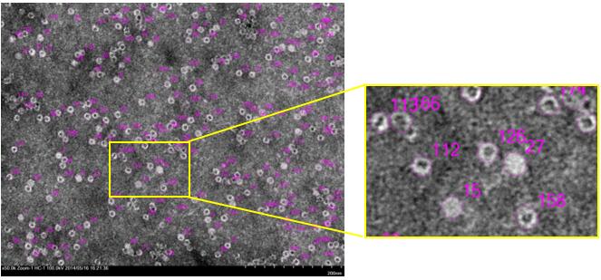 透射電子顯微鏡(TEM)是觀察病毒形態(tài)的最佳工具。日立透射電鏡HT7800有高反差和高分辨兩種模式,能同時兼顧生物組織的大視野觀察和病毒的高分辨觀察。其 Specimen Search (自動顆粒搜索功能)可以自動尋找病毒顆粒,并進(jìn)行記錄統(tǒng)計。